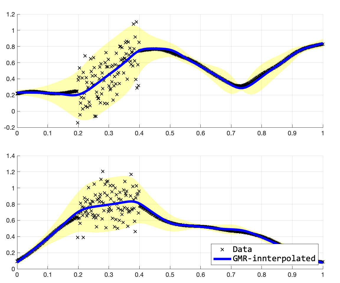 위의 수식이 GMR의 수식이다. 내가 참고한 논문에서는 $\hat{\Sigma}$를 적을 때, 괄호가 빠져있어서 조금 어려움이 있었는데, 모 논문들이 다 그렇지모. 여튼 위의 수식을 구현해보면 아래의 그림을 얻을 수 있다. 여기서 주의깊게 보고 싶었던 것은 이차원의 출력들 사이의 dependency가 어떻게 잡히나, 그리고 이를 통해서 extrapoloation이 얼마나 잘 되는지였는데, 나쁘지 않다.