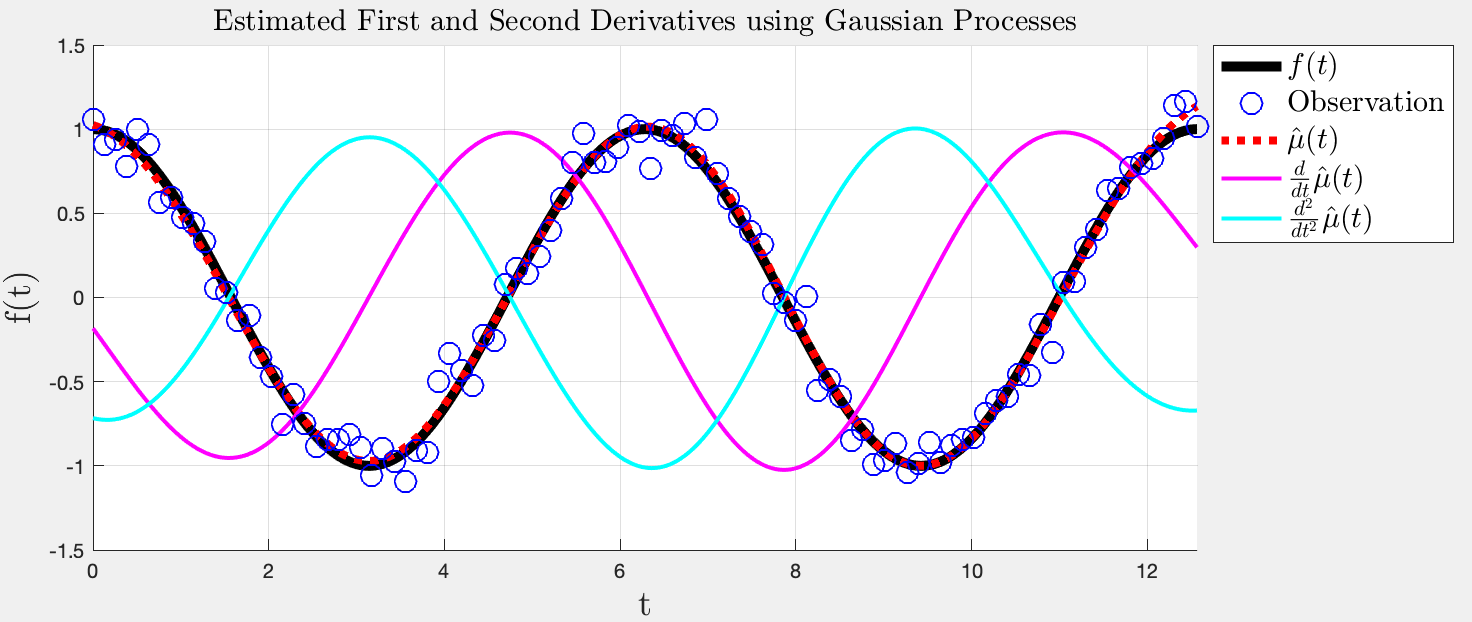 plot_title('Estimated First and Second Derivatives using Gaussian Processes',...